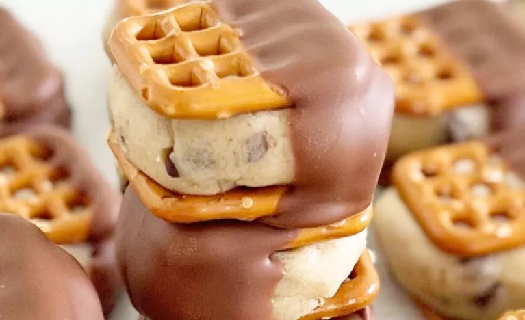 Prepare baking tray with wax/parchment paper, or silicon mat. Remove Cookie Dough/pretzels from refrigerator and carefully dip 1/2 into melted chocolate. Set on prepared surface. Once all are dipped, move tray to refrigerator to set for 10-15 minutes. Store any extra cookie dough bites in an air tight container in the refrigerator for up to 2 weeks